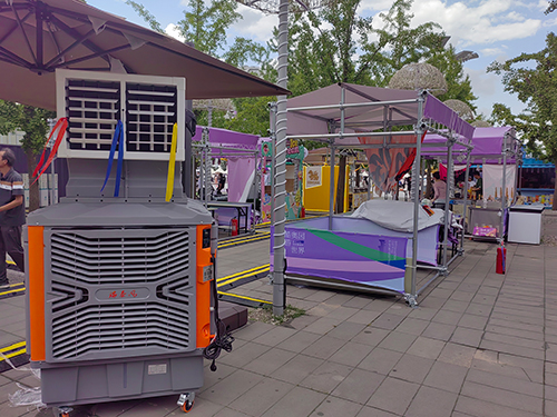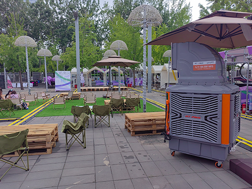 2.在降溫原理上,設備堅守環保初心,采用水循環蒸發吸熱技術,通過自然物理過程降低空氣溫度,全程無需氟利昂等制冷劑,從根源上避免傳統空調的溫室氣體排放,完美契合戶外餐飲的綠色發展需求。300L大容量水箱搭配便捷加水口,一次加水即可連續運行一整天,輕松覆蓋整晚營業時段;若搭配專用冰晶盒使用,冷風溫度可進一步降低,持續為場地輸送沁爽涼意。