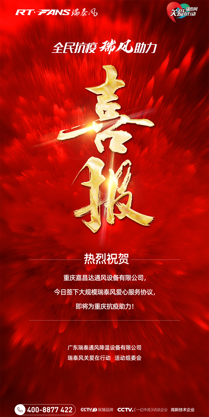 其中,重慶嘉昌達通風設備有限公司9日取得重慶市多地愛心服務機會,將為火熱的重慶,為奮斗在抗疫一線的醫護人員及重慶大規模排隊接種疫苗的市民,送來戶外健康清涼之風,希望一定程度上可以緩解高溫天困擾,傳遞全體瑞泰風人之愛,為繼蘇州展旭嘉團隊之后連續第2天取得全國關愛行動突破性進展。
